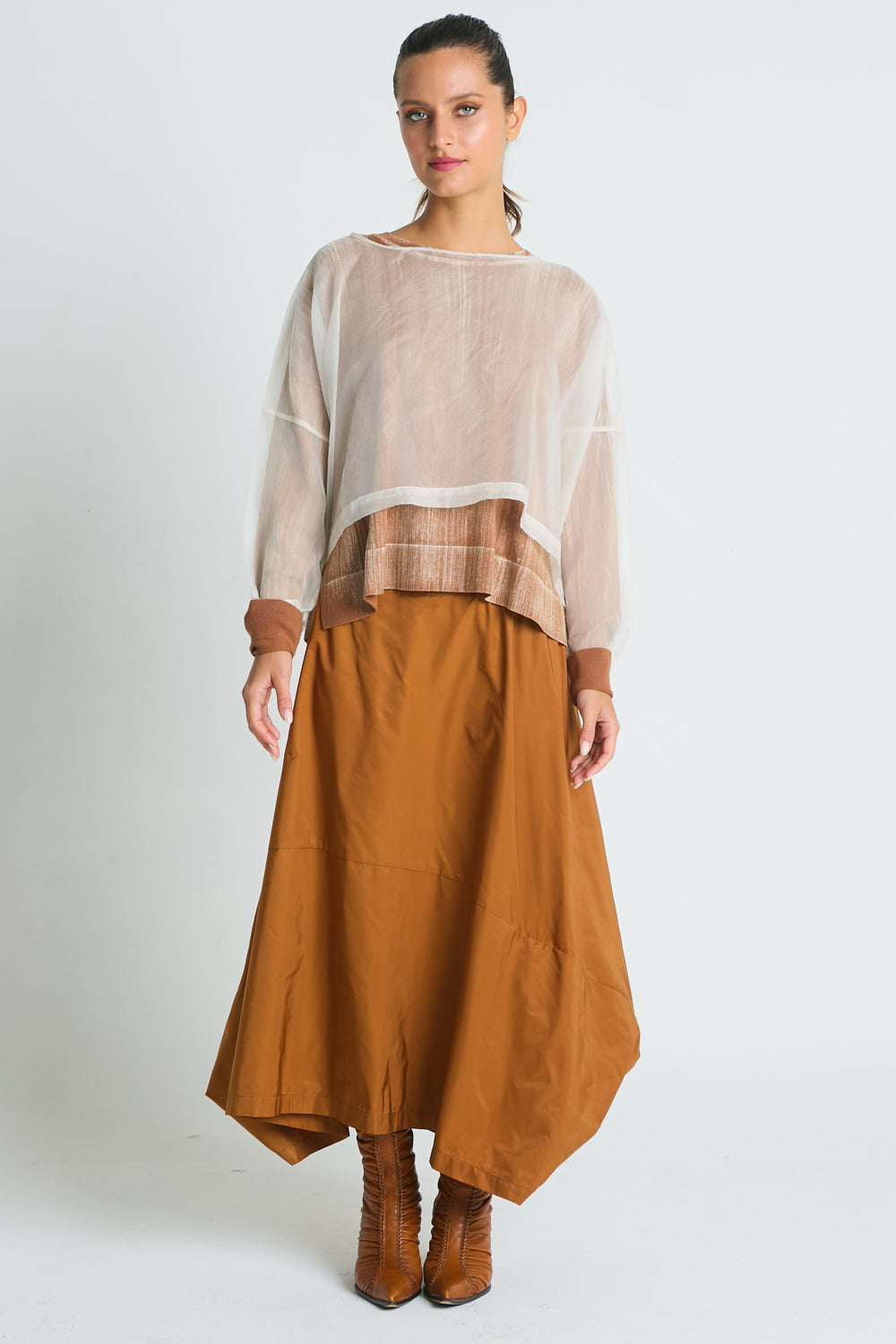 Our signature architectural skirt is in sync with our brand’s DNA. Sculptural yet fluid, this skirt brings a bold shape to everyday dressing. Crafted from crisp, lightweight nylon, it features clean pleating, subtle volume, and an easy elastic waistband for all-day comfort. The asymmetric hem and directional silhouette make it a statement piece that still feels effortless—perfect for styling with soft knits, structured tops, or minimal tanks.