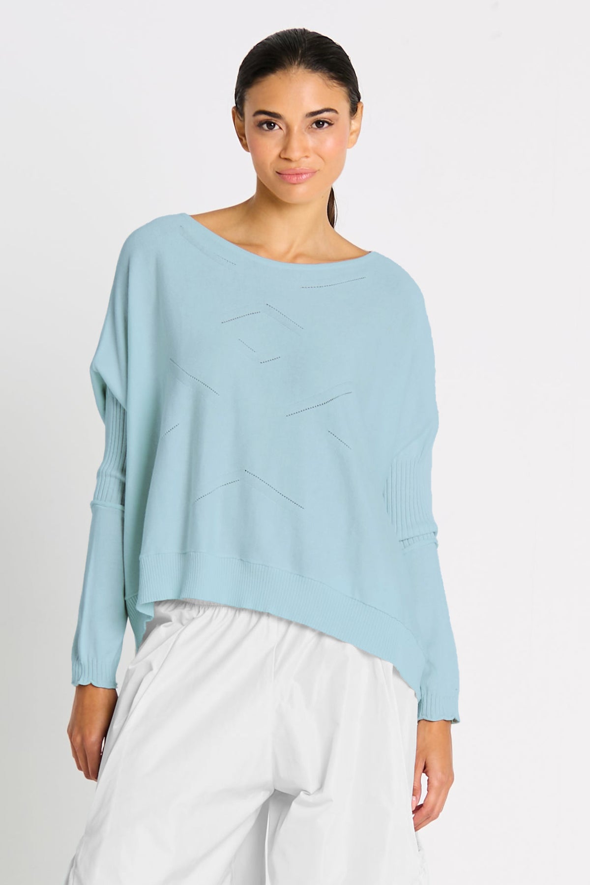This elevated essential is all about quiet detail. Crafted from ultra-soft Pima cotton, the Stitches Boat Neck Sweater features tonal linear stitchwork that adds depth without distraction. A modern boxy shape, ribbed sleeve accents, and an angled hem make it a standout layering piece—lightweight, breathable, and effortlessly chic from every angle.