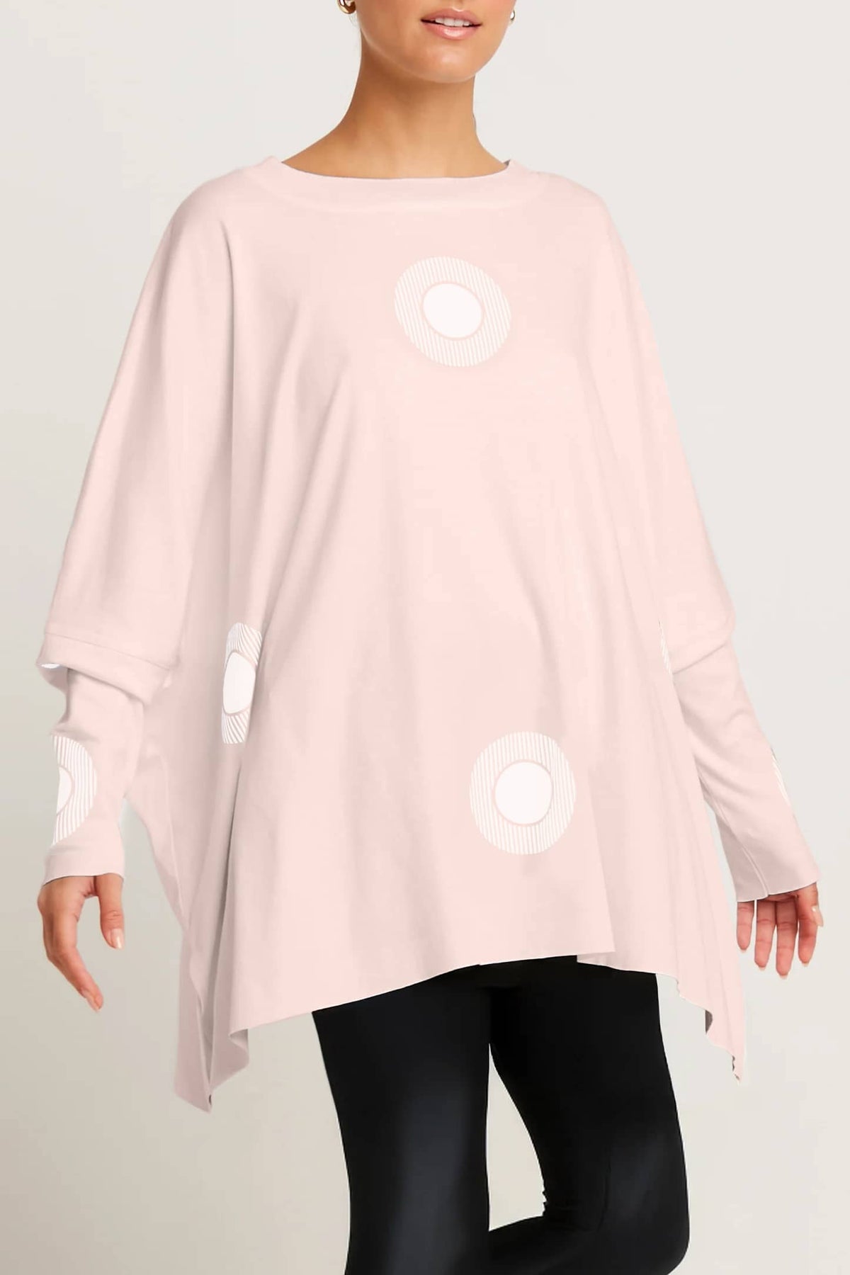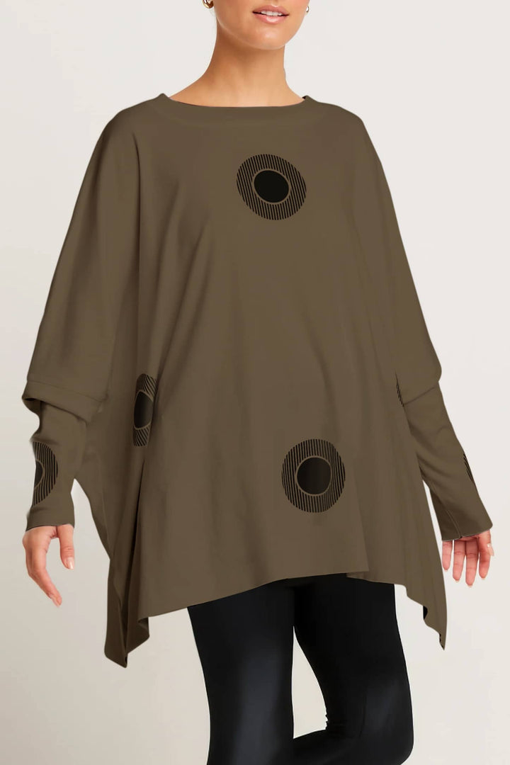 This top is pretty and comfortable. The cut allows a lot of room, yet drapes in a very appealing way, so it does not appear super large. The fabric is yummy.