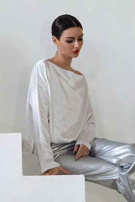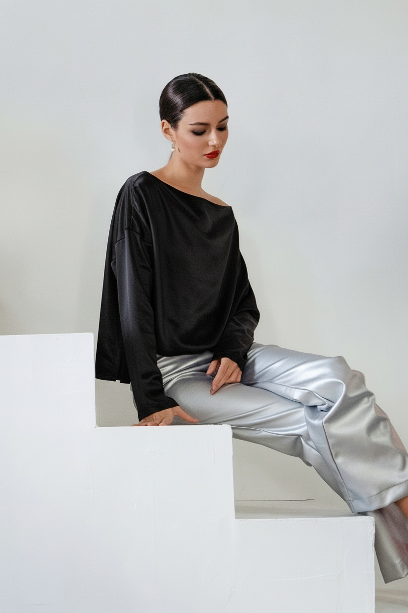 Simply elegant with a festive twist, our Holiday Sateen Evening T is designed to shine through the season. Crafted from luxurious sateen with a soft, luminous sheen, this elevated tee transitions effortlessly from daytime gatherings to evening celebrations. The adaptable neckline can be worn as a classic boatneck or styled off the shoulder for a more dressed-up holiday look. An essential holiday top that blends comfort, versatility, and polished style—perfect for festive outfits, winter events, and everyday elegance.
